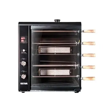 Pemanggang ayam gas dengan pintu kaca transparan, 5 skewers, kontrol suhu digital, hemat energi, dan hasil panggangan merata.