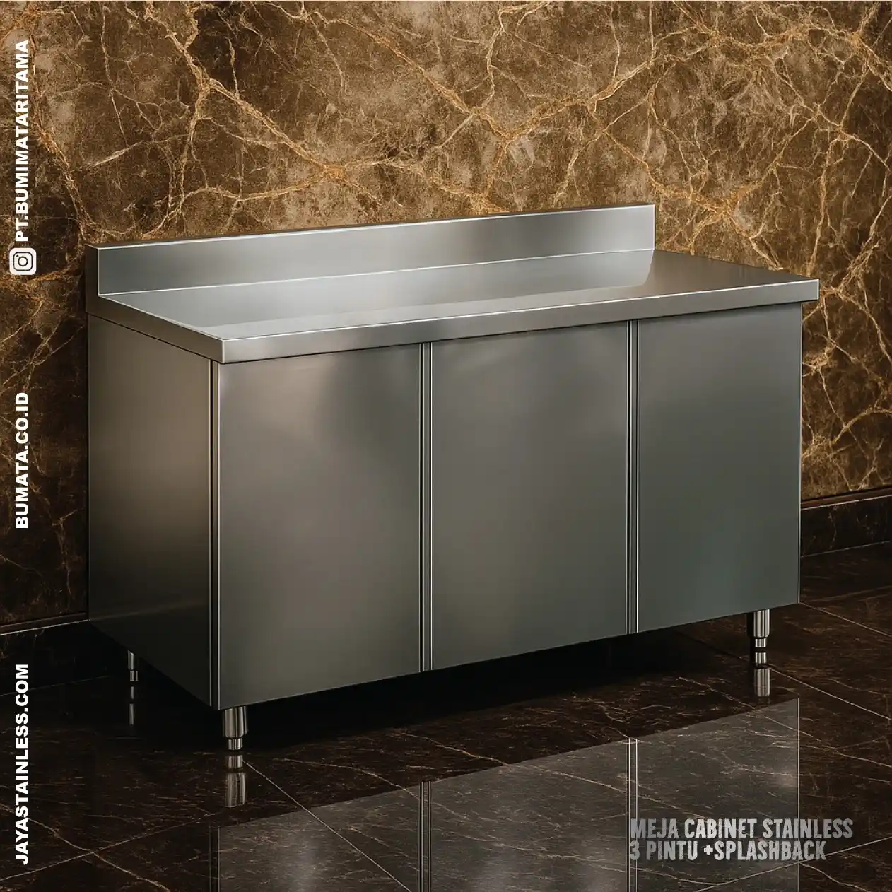 Meja Cabinet Stainless 3 Pintu + Splashback – Kokoh, Higienis & Praktis untuk Dapur Modern